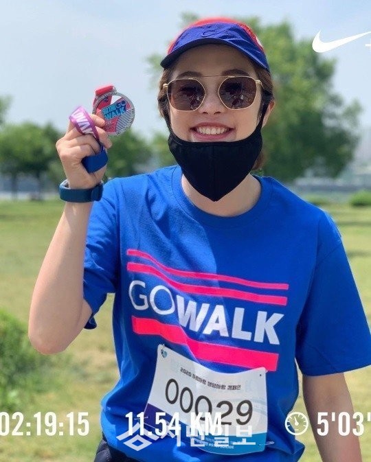 공개된 사진 속 황보라는 'GO WALK'라는 글이 새겨진 파란색 티셔츠를 입고 선글라스와 모자, 마스크를 착용한 채 엄지척 포즈를 취하고 있는 모습으로 훈훈함을 자아냈다.