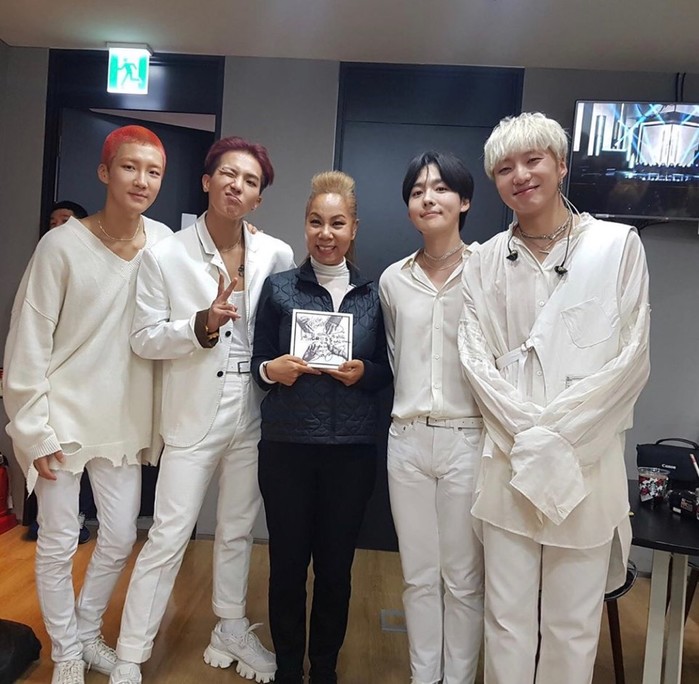 공개된 사진 속 인순이는 함박 미소를 지으며 위너 멤버들과 카메라를 쳐다보고 있는 모습이다.