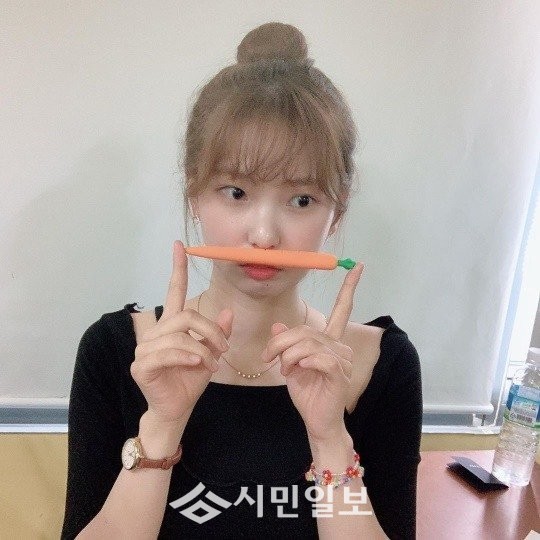 사진 속 최유진은 당근 모양의 볼펜을 코에 대고 상큼한 미모와 함께 깜찍한 매력을 과시해 팬심을 사로잡았다.