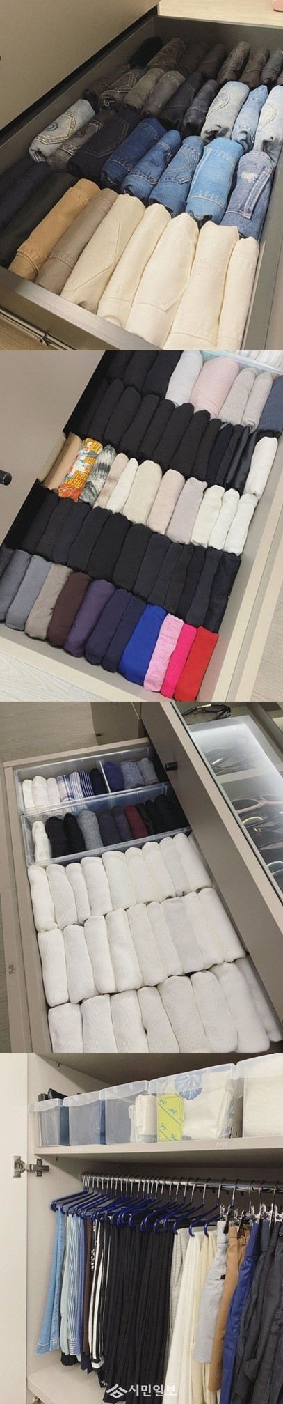 공개된 사진 속 한채아는 드레스룸을 정리한 후 인증샷을 남심 모습으로 티셔츠와 바지, 양말, 손수건, 각종 선글라스를 단정하게 정리한 모습으로 감탄을 자아냈다.