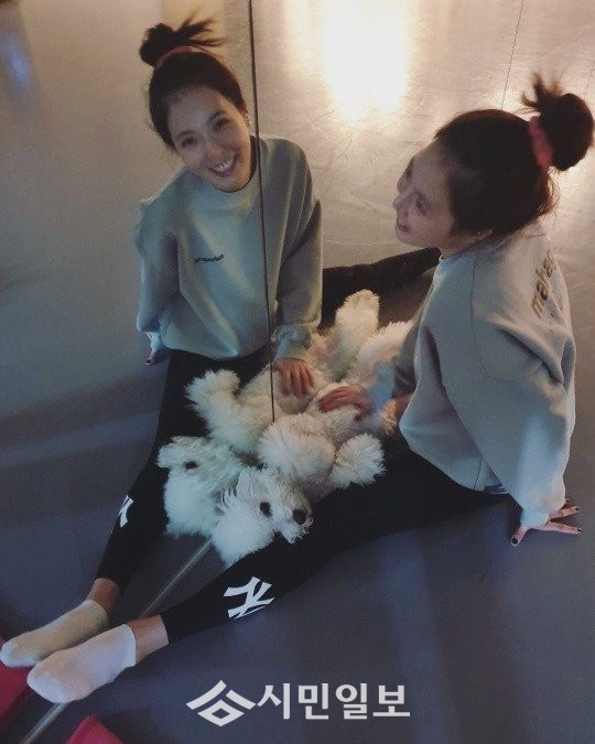 공개된 사진 속 현아는 연습실 거울을 마주한 채 다리를 찢고 스트레칭 중으로 다리와 거울 사이에 반려견 소금이가 드러누워있는 모습으로 웃음을 자아냈다.