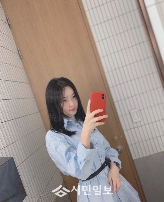 공개된 사진 속 김유지는 하늘색 셔츠원피스를 입고 자신의 휴대폰 카메라로 거울샷을 찍는 모습으로 남심을 사로잡았다.