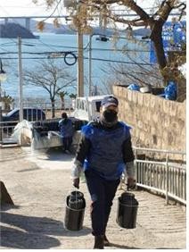 | 연탄 배달 봉사를 하고 있는 김향삼씨 |