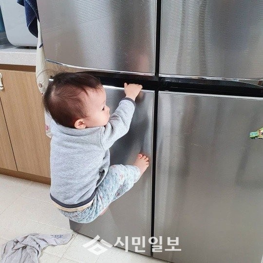 공개된 사진에는 조현재, 박민정 부부의 아들 우찬 군이 조그마한 손과 발로 힘을 주고 냉장고를 잡고 올라타고 있는 모습으로 웃음을 자아냈다.