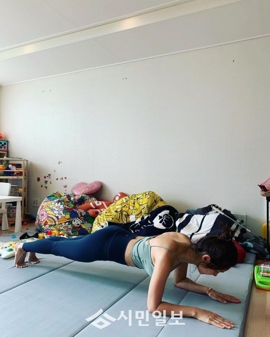 공개된 사진 속 김빈우는 집에서 트레이닝복을 입고 열심히 운동을 하고 있는 모습으로 감탄을 자아냈다.