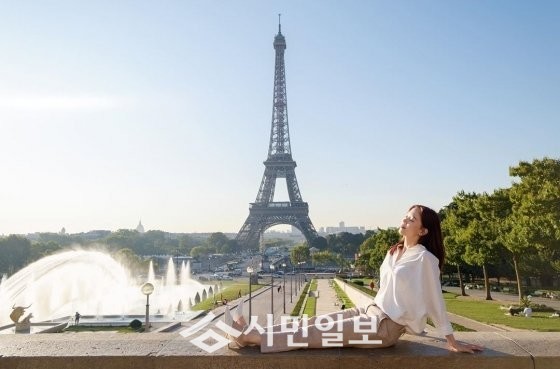 강한나는 프랑스 파리 에펠탑과 분수를 배경으로 여유로운 모습을 드러내 감탄을 자아냈다.