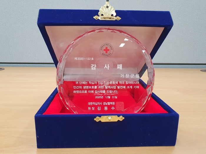 그동안 코로나19 확산으로 다수인이 모이는 행사를 자제하는 어려운 상황에서 거창군민의 적극적인 헌혈 참여와 이번 감사패 및 ‘봉사상’ 수상을 통해 헌혈로 따뜻한 이웃사랑을 표현하여 타 지자체에 모범이 되는 뜻깊은 한 해가 됐다.