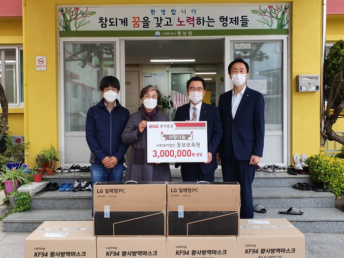 BNK투자증권은 지난 6일 오후, 부산 해운대구와 동래구에 소재한 어진샘 노인종합복지관과 아동복지시설 새들원, 창원의 아동양육시설 동보원을 방문해 1000만원 상당의 학습용 PC, 냉장고, 의류용 건조기 등을 기탁했다.