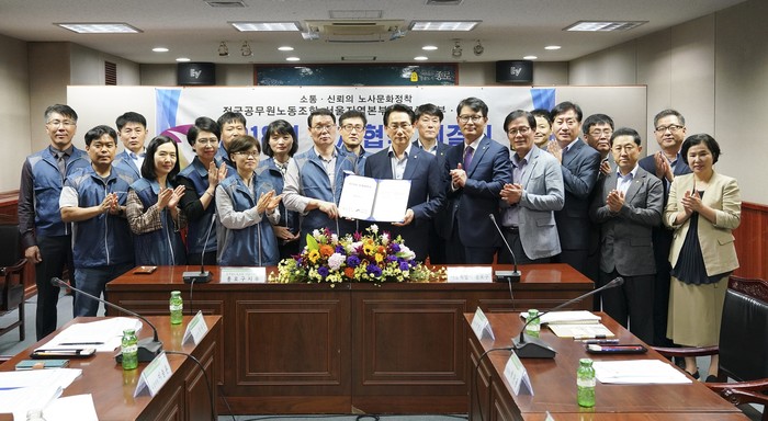 서울 종로구가 직원들의 근무여건을 개선을 위해 최근 구청 기획상황실에서 전국공무원노동조합 서울지역본부 종로구지부와 단체협약 체결식을 개최했다. 사진은 김영종 구청장이 단체협약을 체결하고 기념촬영을 하고 있는 모습.(사진제공=종로구청)