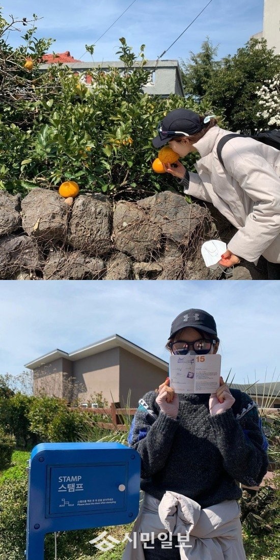 배우 한지혜는 자신의 인스타그램에 "귤 향이 좋다. 향이 궁금해서 향만 맡아봤어요:) #올레15코스"라는 글과 함께 근황을 담은 인증 사진을 공개했다.