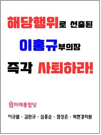 이 부의장에 대해서는"당론에도 불구하고 본인의 사욕을 위해 결정된 사항을 바꾸기 위해 본인에게 유리한 상황으로 원 구성을 유도한 해당행위로 분열을 초래하고 자존심과 위상을 심각하게 훼손시켰다"며 부의장직 사퇴를 촉구했다.