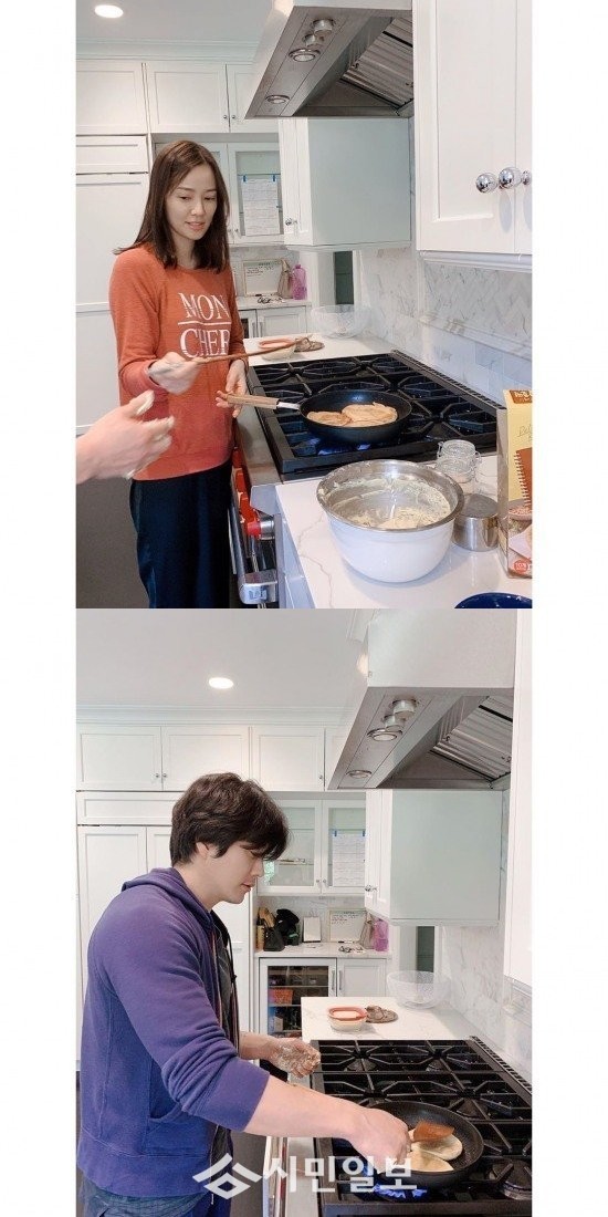 공개된 사진 속 손태영은 남편 권상우와 함께 자택에서 아이들에게 줄 호떡을 구으며 달달한 모습을 선보여 훈훈함을 자아냈다.