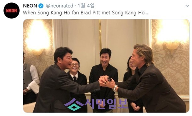 영화 ‘기생충’의 미국 배급사 네온은 공식 트위터 계정에 “송강호 팬 브래드 피트가 송강호를 만났을 때”라는 글과 함께 한 장의 사진을 게재했다.