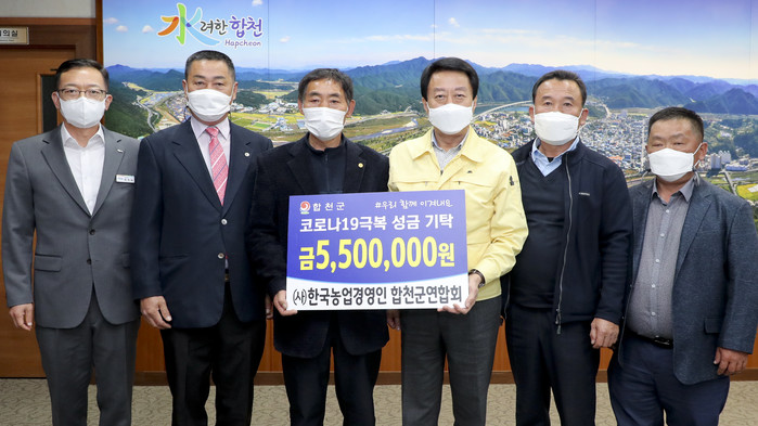 합천군 (사)한국농업경영인 합천군연합회(회장 여한훈)에서 지난 15일 합천군청을 방문해 코로나19로 어려움을 겪고 있는 군민들을 위해 써 달라며 성금 550만원을 기탁했다고 밝혔다.