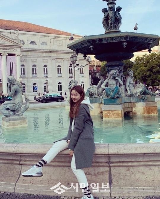 사진 속에는 분수대에 걸터앉은 성유리의 모습이 담겨 시선을 사로잡았다.