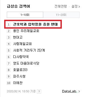 '간호학과 입학정원 증원 반대'는 간호사 취업을 준비하는 이들이 14일 오후 6시부터 키워드를 입력해 포털 사이트 실시간 검색어(실검) 순위에 올리는 일명 ‘실검 운동’을 벌인 것.