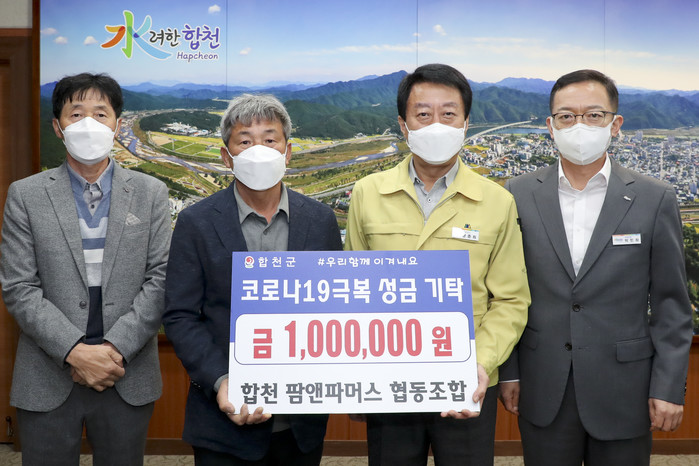합천군 팜앤파머스 협동조합(회장 정상국)은 지난 16일 코로나19를 함께 극복하고 어려움을 겪는 이웃들에게 조금이나마 보탬이 되고자 합천군청을 방문하여 성금 100만원을 기탁했다고 밝혔다.