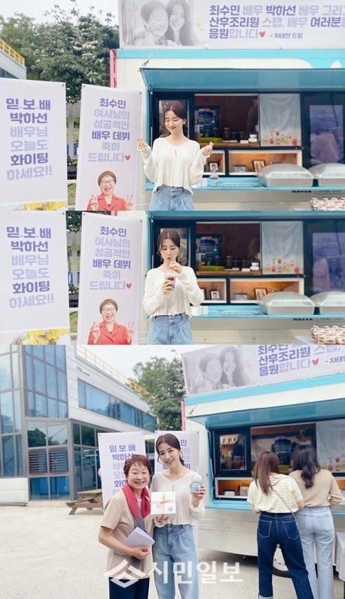 사진 속 박하선은 차태현이 tvN 새 드라마 '산후조리원' 촬영장에 보내준 커피차 앞에서 인증샷을 남기고 있는 모습으로 훈훈함을 자아냈다.