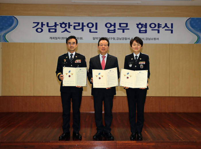 정순균 서울 강남구청장이 최근 강남구청 3층 큰회의실에서 열린 ‘강남핫라인 업무 협약식’을 맺었다. 사진은 박영대 강남경찰서장, 정순균 구청장, 김숙진 수서경찰서장(왼쪽부터)이 협약서에 서명 후 기념촬영을 하고 있는 모습.(사진제공=강남구청)
