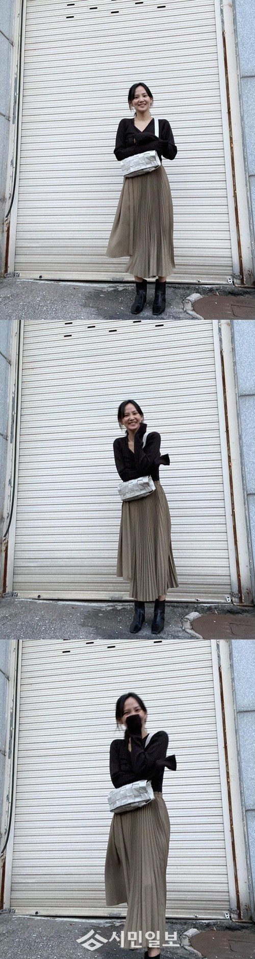 배우 윤승아는 자신의 인스타그램에 "집앞에서 사진을 남겨 봅니다"는 글과 함께 사진 세 장을 게재했다.