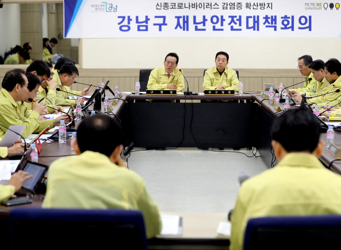 서울 강남구가 7일 오전 9시 강남구청 4층 회의실에서 정순균 구청장 주재로 한 신종 코로나바이러스 감염증 대책 회의를 열고, 신종 코로나바이러스 감염증 관리 현황 및 각 부서별로 추진하고 있는 대응 계획 등을 논의했다. 사진은 정순균 구청장이 관계자들과 대책을 논의하고 있는 모습.(사진제공=강남구청)
