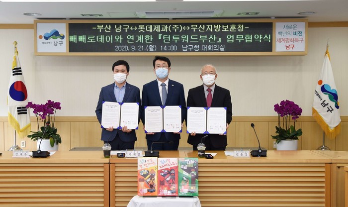 이날 업무협약식은 부산 남구청 5층 대회의실에서 진행됐으며, 롯데제과 김대우 상무, 박재범 남구청장, 권율정 부산지방보훈청장 등 코로나-19 상황을 감안해 최소 인원이 참석했다.