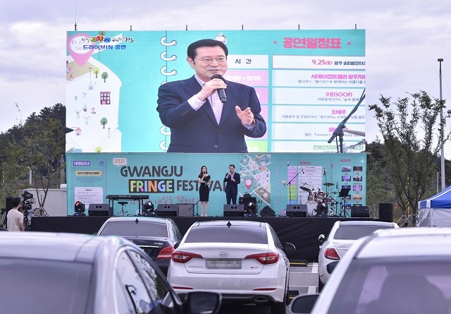[광주=정찬남 기자] 이용섭 광주광역시장이 25일 오후 광산구 빛그린산단 광주글로벌모터스(GGM) 주차장에서 '2021 광주프린지페스티벌' 9회차 분산형 공연으로 진행된 글로벌모터스 드라이브인 행사에 참석해 인사말을 하고 있다.
