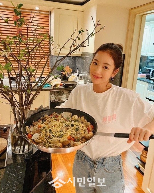 공개된 사진 속 기은세는 여전한 동안 미모를 뽐내며 커다란 후라이팬을 들고 파스타를 자랑하는 모습으로 시선을 사로잡았다.