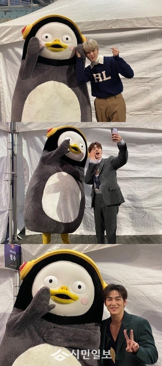 사진 속 펭수는 렌과 손을 꼭 잡고 있다. 이어 황민현, 백호와 사진을 찍는 모습으로 웃음을 자아냈다.