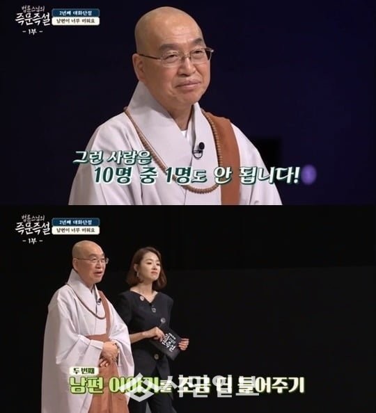법륜스님은 "20년간 대화를 해왔다는 건 남편을 바꾸려고 했던 것"이라며 "바뀌지 않으니 대화하기 싫다는 생각이 드는 거다. 내가 말을 하는 게 아니라 상대 이야기를 들어주고 수긍해주는 게 소통이고 대화다. 그럴 때 남편이 '우리 아내가 심리적으로 불안하구나, 감싸안아줘야겠다'고 생각하면 얼마나 좋겠나. 근데 상대에게 그런 걸 요구하는 건 너무 어려운 것"이라고 말했다.
