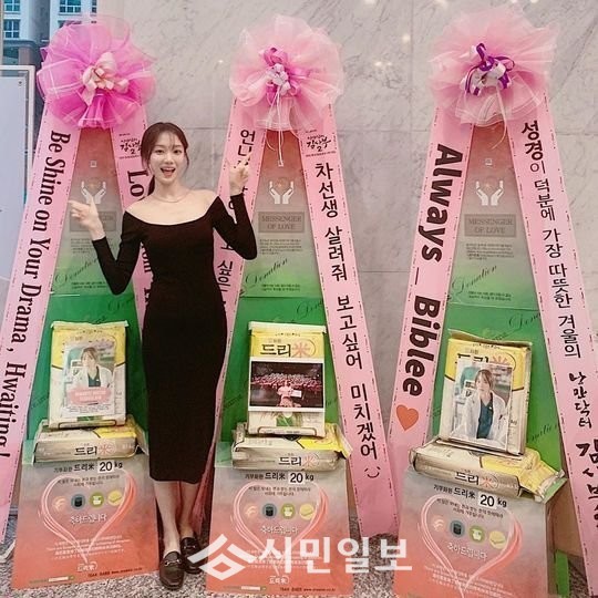 공개된 사진 속 이성경은 팬들이 선물한 쌀 화환 앞에서 밝은 미소를 드러내 팬심을 사로잡았다.