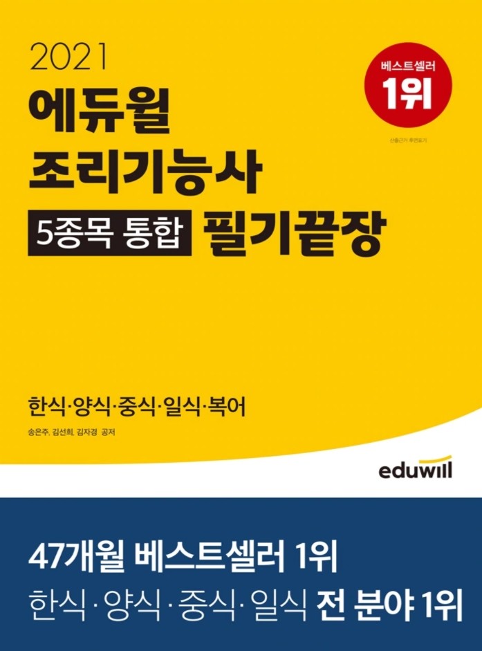 [시민일보 = 여영준 기자] 종합교육기업 에듀윌(대표 박명규)의 ‘2021 에듀윌 조리기능사 5종목 통합 필기끝장’이 온라인서점 예스24의 2월 4주차 양식, 일식, 중식 부문에서 베스트셀러 1위를 달성 중이다.