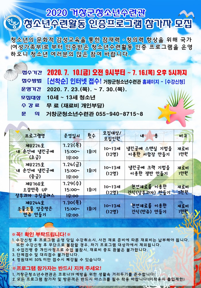 프로그램 접수는 7월 10일부터 16일까지 10~13세 청소년을 대상으로 거창군청소년수련관 홈페이지를 통해 선착순으로 모집하며,