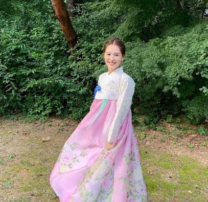 공개된 사진 속 김재경은 푸른 자연을 배경으로 흰색과 분홍색이 매치된 한복을 입은 채 함박 미소를 짓고 카메라를 쳐다보고 있는 모습이다.