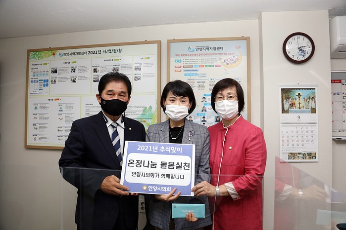 [안양=최휘경 기자]경기도 안양시의회 최우규 의장(사진 좌측)과 박정옥 부의장(사진 우측), 김산호 시의회 사무국장은 추석 명절을 맞이해 지난 15일 관내 복지시설 해밀지역아동센터(센터장 이복실) 등 5곳을 찾아 위문품을 전달하고 복지시설 이용에 대한 애로사항을 청취했다.