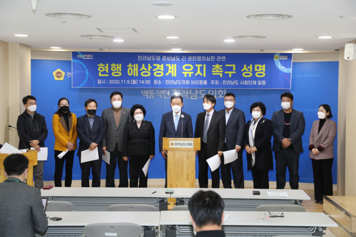 황금영 전라남도 사회단체연합회장은" 전라남도의회 브리핑룸에서 성명서를 낭독하면서 현행 해상경계선을 기준으로 전라남도 어업인이 조상대대로 삶의 터전으로 이용해 온 바다를 경상남도에서 해상경계선을 변경해야할 특별한 사유가 없음에도 변경을 요구하고 있어 양 도민 간 갈등을 유발하고 있다"고 말했다.