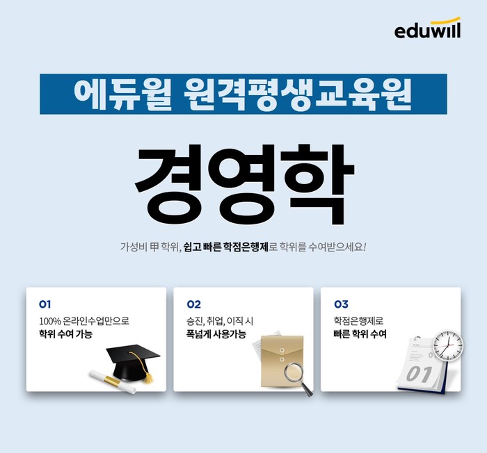 [시민일보 = 여영준 기자] 종합교육기업 에듀윌(대표 박명규)은 원격평생교육원 학점은행제 과정 운영을 통해 효율적인 경영학 학위 취득을 지원하고 있다고 밝혔다.