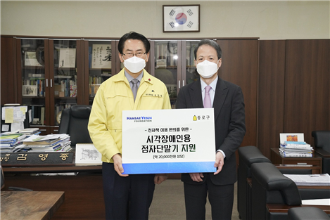 | ▲ '점자단말기 전달식'에서 김영종 구청장(왼쪽)이 한세예스24문화재단 이재무 사무국장으로부터 단말기를 전달받고 기념촬영을 하고 있다.(사진제공=종로구청) |