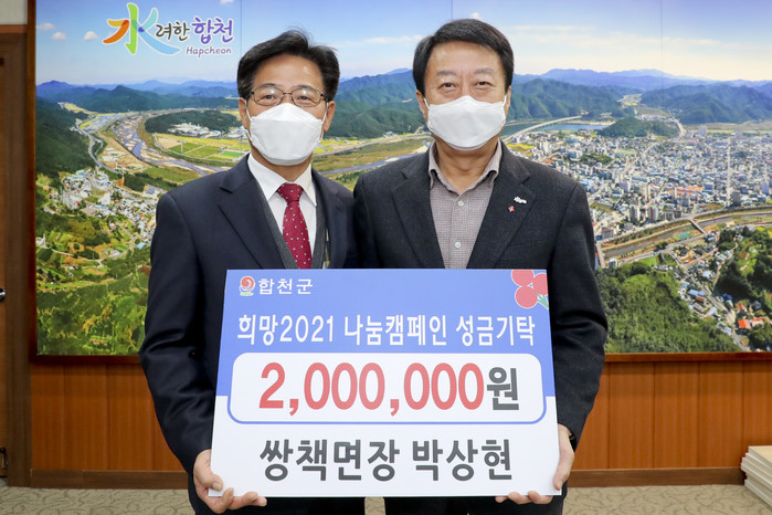 경남 합천군 쌍책면장 박상현은 24일 합천군청을 방문해 청덕면 ‘평화마을사랑의 집(장애인거주시설)’에 써달라며 이웃돕기 성금 200만원을 기탁했다.