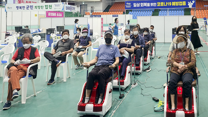 합천군(군수 문준희)은 8월 12일부터 코로나19 예방접종센터 이상반응 관찰구간에 접종 후 이상반응 15~30분 대기로 인한 불편을 조금이나마 해소하고 건강증진에 도움이 되고자 다리마사지기 15대를 배치하는 등 편의 지원을 제공하고 있다.