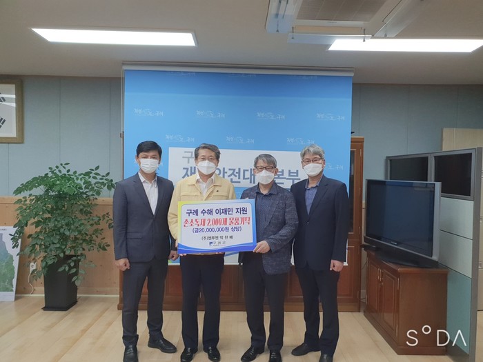 이날 전달된 살균소독제는 총 2,000개(2,000만원 상당)로 박찬배 대표는 “코로나19 사태와 수해가 맞물려 세균 감염 우려가 큰 상황에서 수재민들에게 조금이나마 보탬이 되고자 물품을 지원하게 되었다”고 밝혔다.
