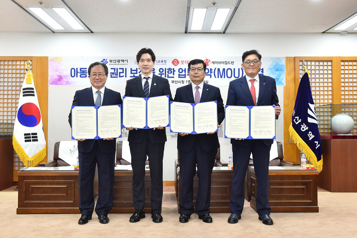 ‘스위트스쿨’ 사업 전개를 위해 롯데제과는 세이브더칠드런, 부산시, 부산광역시교육청과 함께 이달 26일 부산시청에서 학교 놀이 환경 개선사업 시행을 위한 4자간 업무협약을 체결했다.