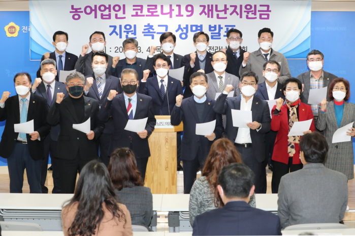 전라남도의회는 4일 오후 1시 30분, 의회 브리핑룸에서 기자회견을 갖고 정부 4차 재난지원금 지급대상에 농어업인을 포함시켜 줄 것을 강력히 촉구하는 성명서를 발표했다.