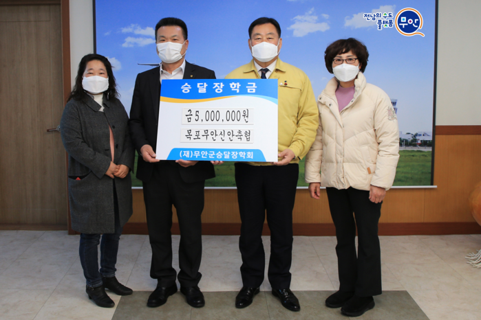 무안군(군수 김산)은 지난 2일 목포무안신안축협(조합장 문만식) 여성조합원 비영리단체인 여성한우회(회장 최명숙)에서 승달장학회에 장학금 500만원을 기부했다고 밝혔다.