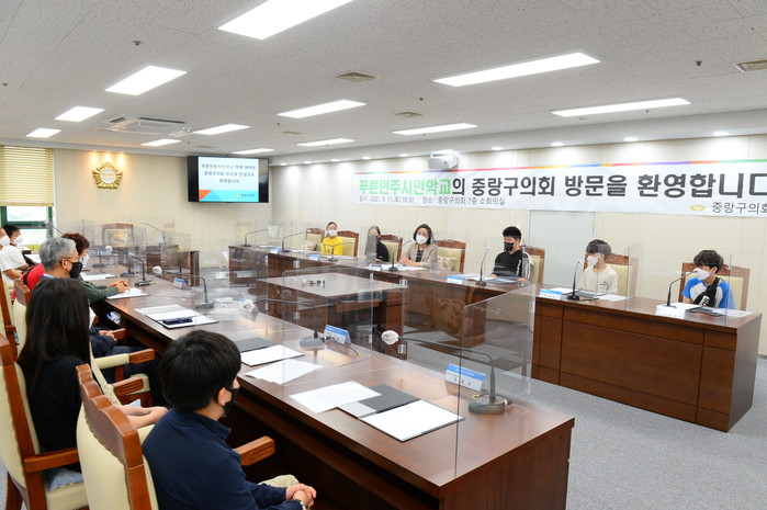 이날은 다른 자치구에서 운영 중인 어린이·청소년의회 구성을 건의하기 위해 인솔 교사 2명과 10명의 학생이 함께 중랑구의회를 찾았다.