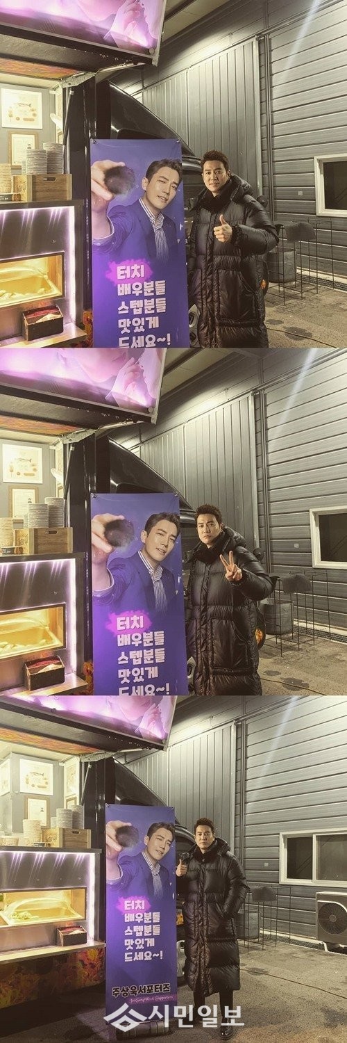 공개된 사진에는 팬들이 채널A 금토드라마 '터치' 촬영장에 보내준 분식차 앞에서 엄지손가락을 치켜세우고 V자를 그리고 있는 주상욱의 모습이 담겨 훈훈함을 자아냈다.