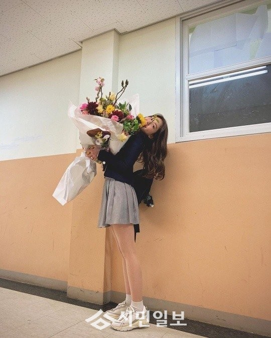 사진 속 전소미는 교복을 입고 자신의 몸보다 큰 꽃다발을 든 채 환하게 웃고 있는 모습으로 이목을 사로잡았다.