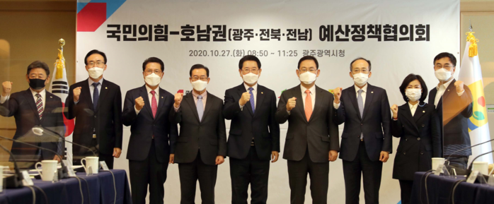 이날 광주광역시청 비즈니스룸에서 가진 예산정책협의회에는 국민의힘 주호영 원내대표, 이종배 정책위의장, 추경호 예결위 간사, 정운천 예결위원, 임동하 전남도당위원장 등이 참석했다.