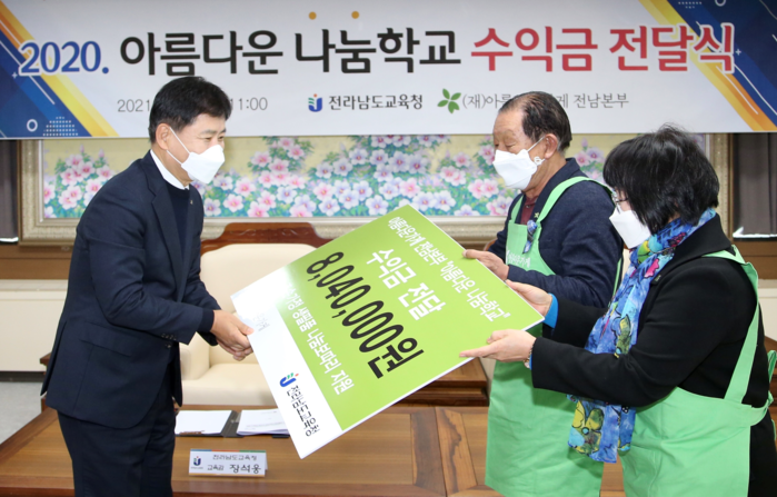 (재)아름다운가게 전남본부(공동대표 이상률·박소정)가 4일(목) 전라남도교육청에서 지난해 진행한 ‘아름다운 나눔학교’ 수익금을 장석웅 전남교육감에게 전달했다.
