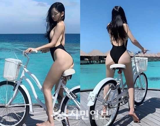 공개된 사진에는 내리쬐는 햇볕 아래 블랙 모노키니를 입고 육감적인 몸매를 뽐내며 하얀 자전거를 모는 신재은의 모습이 담겨 감탄을 자아냈다.